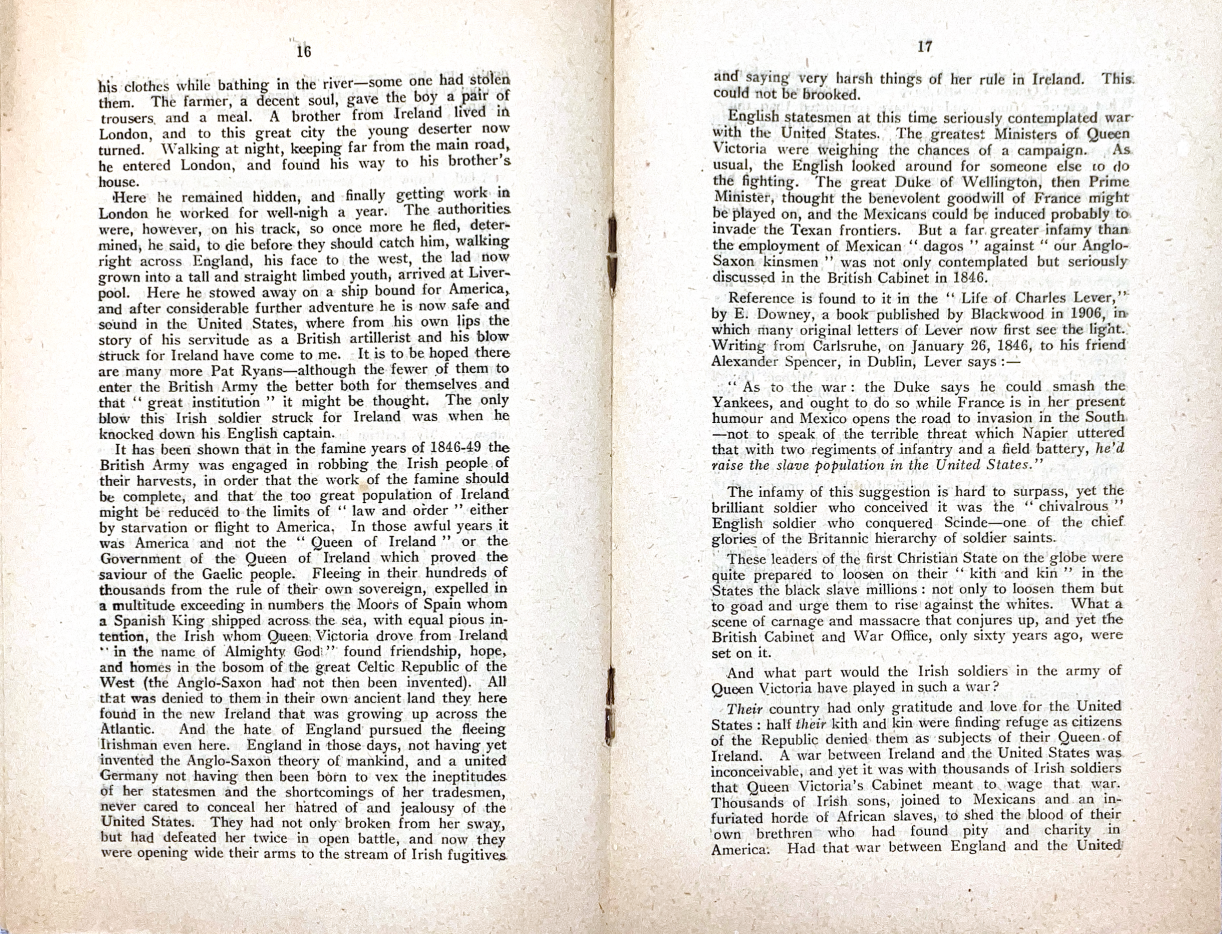 On p. 15, wrongly numbered 16, the author gives an anecdote. The story is of a young man from Leitrim, named Pat Ryan,—whom the author allegedly knew—who enlisted, driven forth by famine. After the captain called him an “Irish pig,” Pat Ryan delivered a brutal punch. He was stripped of his clothes and locked in a prison-room, which he later escaped from.